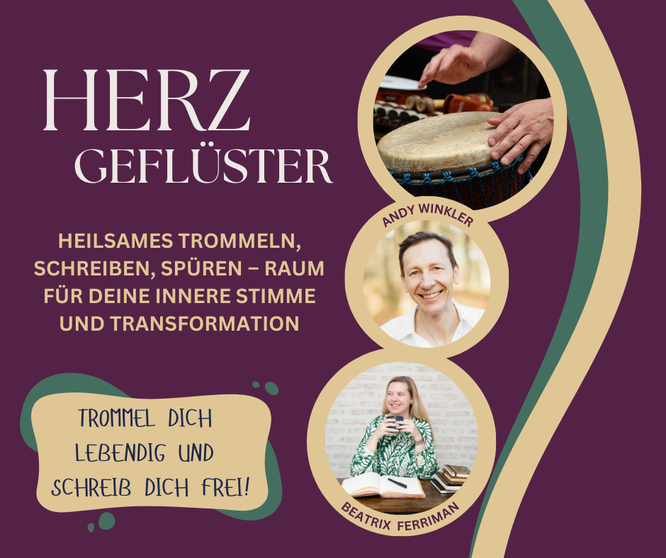 Dieser besondere Workshop findet in 1120 Wien in Kooperation mit dem Trommler Andy Winkler statt - freue dich auf eine wundervolle Kombination aus heilsamen Trommeln und einer kraftvollen Schreibmeditation. Tauche ein in Rhythmus, Stille und Worte - und finde zurück zu dir.